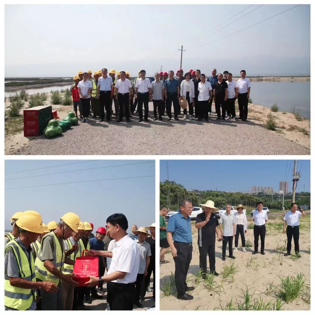 隨后,公司領導一行人來到鹽湖項目11號堤埝施工現(xiàn)場,慰問在高溫酷暑下堅持奮戰(zhàn)在一線的工人,并為他們送去防暑降溫慰問品。同時,深入鹽湖堤埝二號灘和19號路,詳細了解灘面護坡綠化情況,坡面綠草茵茵,不同種類植物長勢喜人;現(xiàn)場查看了傾斜電桿更換和扶正處理后情況,一定程度上消除了安全隱患,確保周邊居民和鹽池防汛調(diào)水用電安全,同時也起到了美化環(huán)境效果。